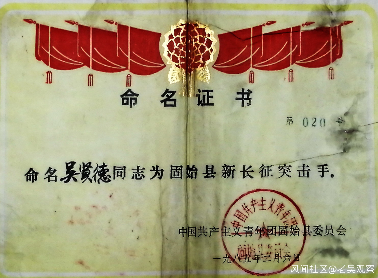 成績是靠自己努力和奮鬥出來,一九八五年二月六月,團縣委為了表彰我這個山區郵遞員在報刊投遞中,不怕翻山越嶺和吃苦耐勞精神,及時把報刊信件送到村部和村民手中,受到村幹部和村民們讚揚,特命名我為“固始縣新長征突擊手”,手捧大紅命名證書,淚水浸透了雙眼,因為她肯定了我這個鄉村郵遞員拼命工作精神。