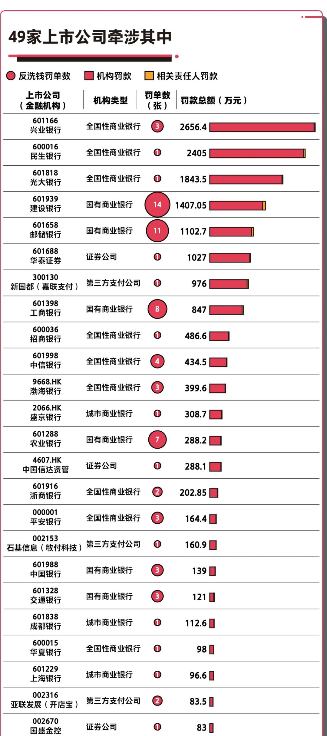 **時代數據經查閲發現,共計有49家上市公司被牽涉其中,其中包括上市銀行、上市券商、上市保險機構、其他非銀行金融機構的母公司,以及第三方支付公司的母公司。**在上述7張千萬級鉅額罰單中,就有興業銀行(601166)、民生銀行(600016)、光大銀行(601818)、華泰證券(601688)4家上市公司牽涉其中。