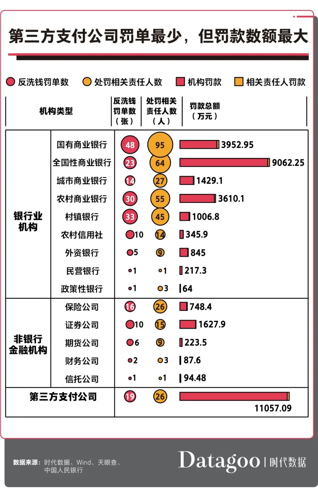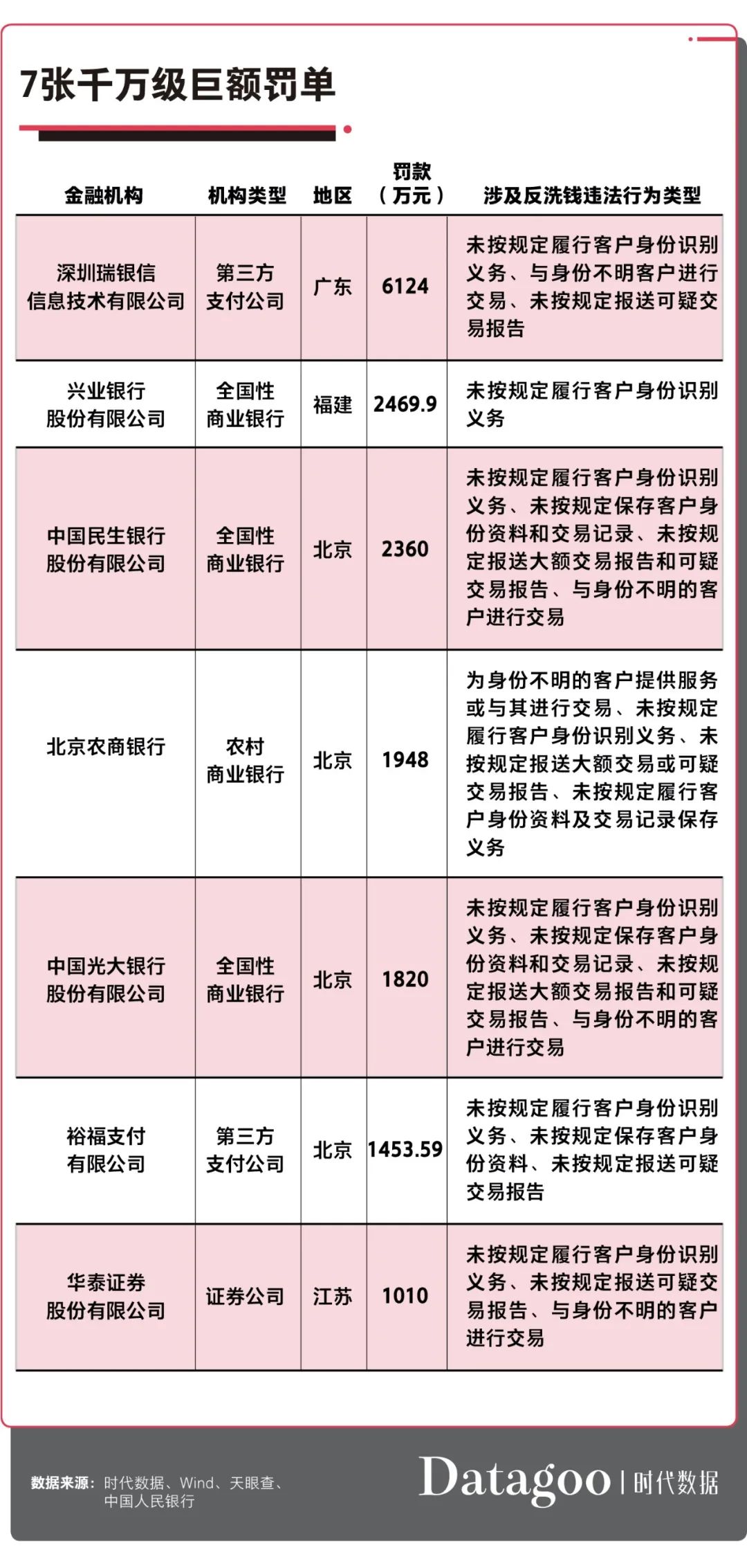 據時代數據梳理,前三季度,央行共開出反洗錢千萬罰單7張,包括3家全國性商業銀行、2家第三方支付公司、1家農村商業銀行和1家證券公司,且都與“未按規定履行客户身份識別義務”有關。