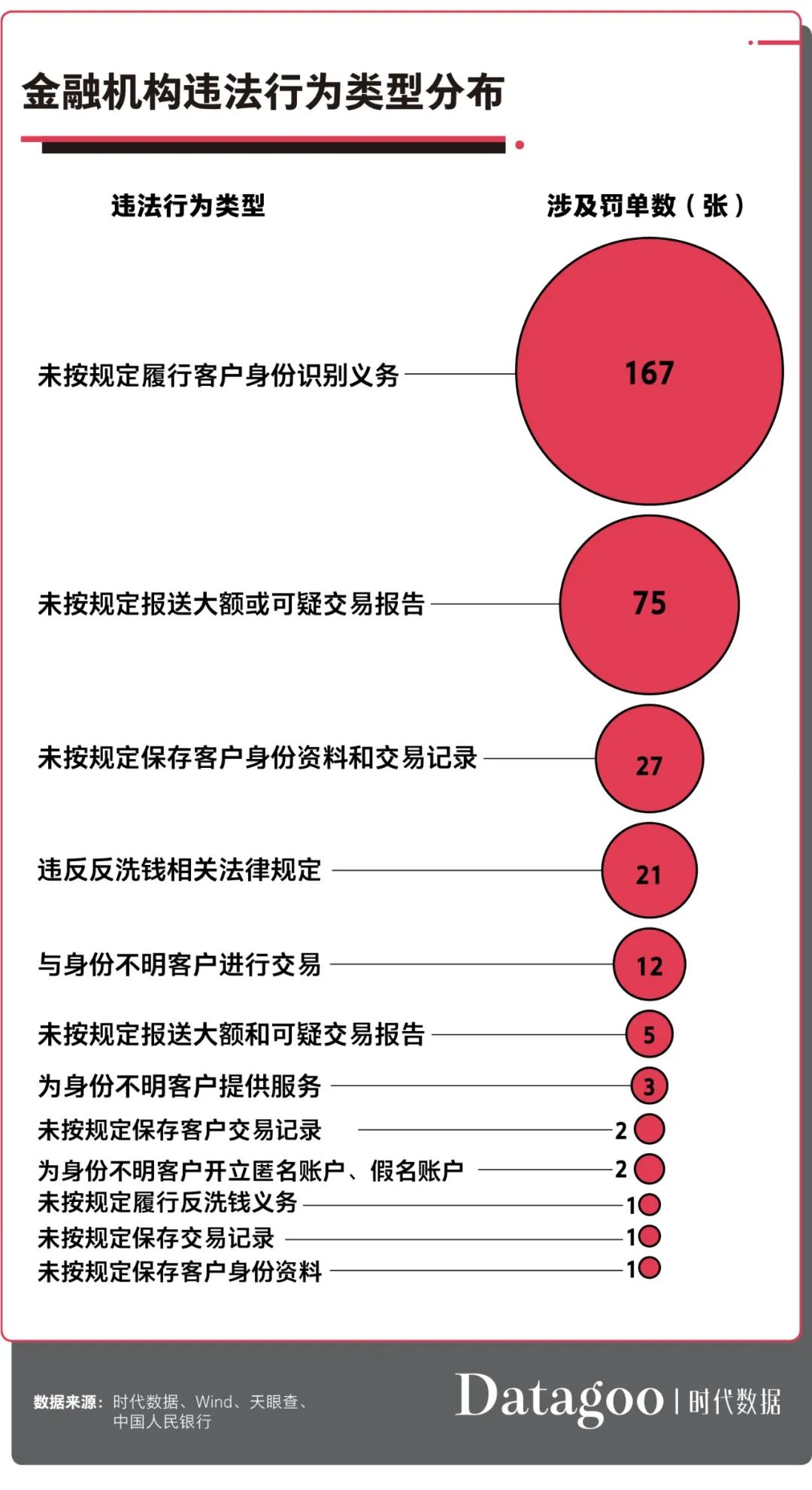 同時,作為反洗錢的第一道防線,金融機構往往首當其衝,理應在確保客户個人信息完善且安全可靠的情況下為其提供服務或者發生交易。但是,時代數據卻發現,仍然有不少金融機構因違反《反洗錢法》的相關規定遭到央行處罰。