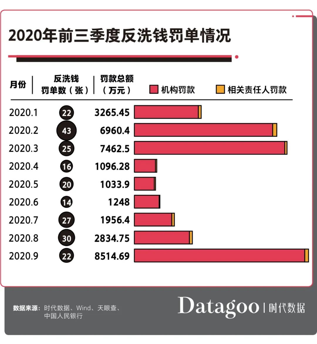 從時間上來看,央行的處罰力度完全沒受到疫情的影響,今年2月份給出的反洗錢罰單最多,達到43張;其次是8月份,金融機構收到30張反洗錢罰單。