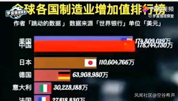 更令美國吃驚的是,中國綜合國力的驚人發展速度。世界銀行經過對60年來全球各國經濟軍事發展統計,列出十項量化指標進行排位,中國在製造業增加值、農業增加值、耗電總量、發電總量、進口總值、貨物和服務出口總額計七項,位列世界第一;軍費開支、軍備出口、海軍總噸位計三項,位列世界第二。