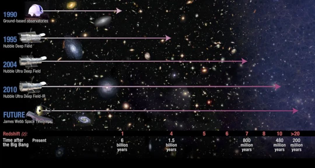 圖4:詹姆斯·韋伯望遠鏡(JWST)的探測範圍可以達到紅移約20,有可能捕捉到第一代恆星的信息(圖源:NASA)