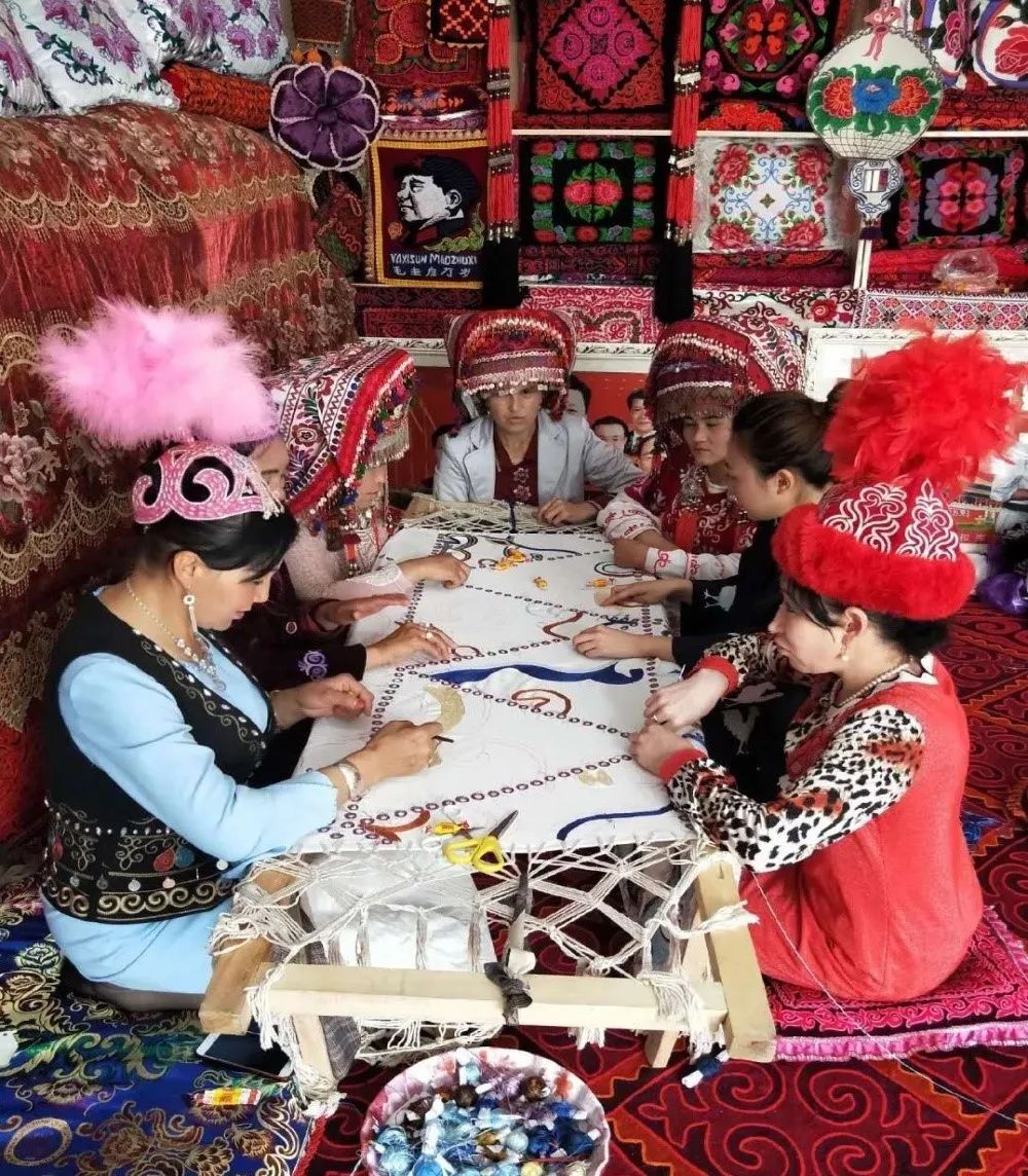 “土什特合”是一種純手繡而成的柯爾克孜族特色牆面掛飾,用綵線在大紅絨布底上繡花,下部呈“W”型的金黃色流蘇。