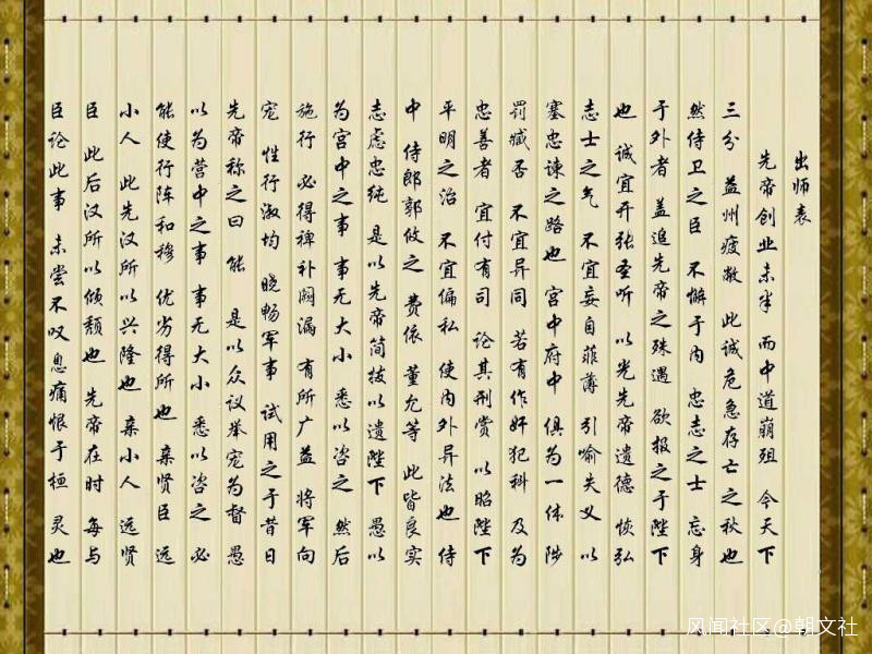 《出師表》是諸葛亮北伐的“宣言書”,這篇700多字的短文深深打動了歷代以來的仁人志士。岳飛説“讀《出師表》而不泣,則其人必不忠也”,陸游一生多次讀《出師表》,每讀一次就寫下一首詩,留下了“出師一表真名世”“出師一表通今古”“凜然出師表,一字不可刪”“出師一表千載無”“一表何人繼出師”等名句。