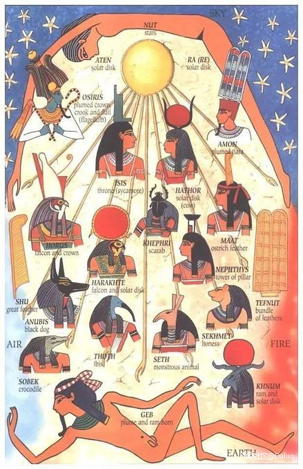古埃及神祗與其他神話最突出的差異便是獸首人身,將非洲常見的動物全都上一遍,鷹鷲、蒼鷺、獅子、胡狼、鱷魚、公牛、羚羊,哎,最後一個讓你覺得不那麼出戏,給你整個聖甲蟲。動物用完了,就得上人了,男、女、藍色膚色,能表達的特徵太少,這神話體系就做不大,這可惱了。但天舞絕人之路,出現了根救命的稻草,那便是奇奇怪怪的頭飾,頂個圓盤,杯子,窗户啥的稍微藝術加工下,還不夠?那就用動物頂頭飾再來一遍。諸多的特點好像都在往“批量生產”的方向靠攏,這究竟是線索,還是巧合?