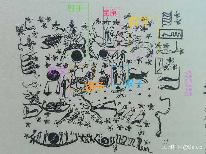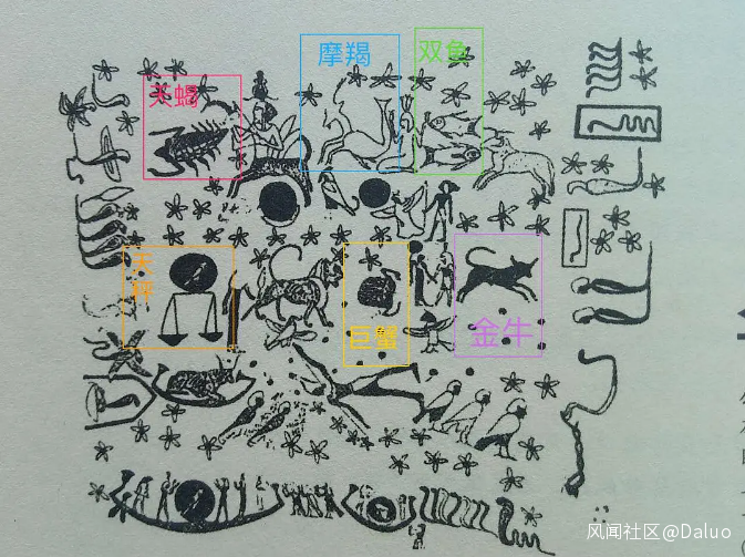 建築物的框架已經建設完畢了,一個高度的文明除了宏偉的建築外,必定要有深厚的人文寶藏。但他們首先想到的不是文學,而是星象。下圖為公元114年羅馬統治時期埃及墳墓中的星座浮雕,與現行的黃道十二宮已經無太大差異。但埃及的歷史越發往前,熟悉的星座就越少,取而代之的是更多埃及特色的星座,到最後只剩下:白羊宮、金牛宮、摩羯宮和處女宮四個。雖然埃及的星相學在隨着發掘不斷完善,但最終沒能完全跳出希臘十二宮的舊認知框架,留下來一個不大不小的彩蛋,引人無數遐想。
