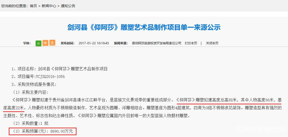 近日,曾為國家級貧困縣的貴州劍河縣被指,建造88米世界最大苗族女神仰阿莎雕塑引發爭議,據@紅星 報道,該縣宣傳部一名工作人員稱,當地政府近3年來將所有資金都用於突擊脱貧攻堅的工作中,原計劃建設的仰阿莎雕塑的一些附屬設施中途已暫停建設。