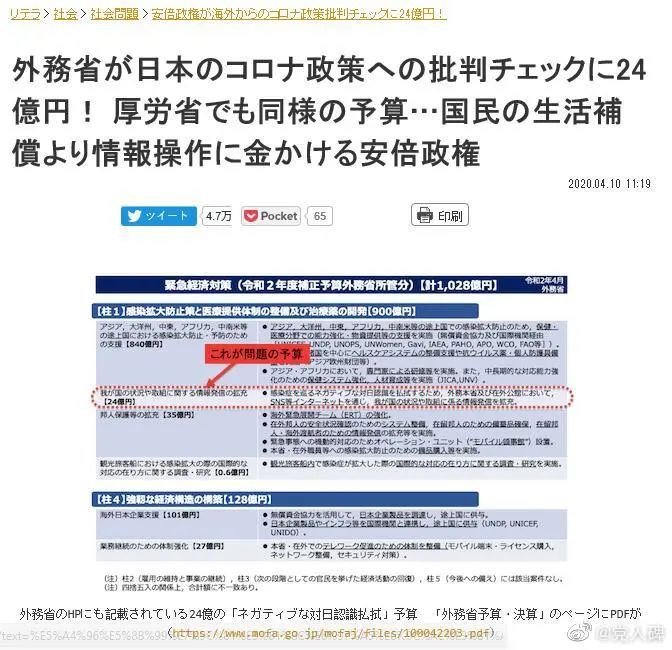 今年4月,日本媒體也發現了,日本政府頒佈的**“應對疫情經濟緊急對策”的資金中,有24億日元是用於“清除改正各國對日本新冠疫情的負面印象”**。