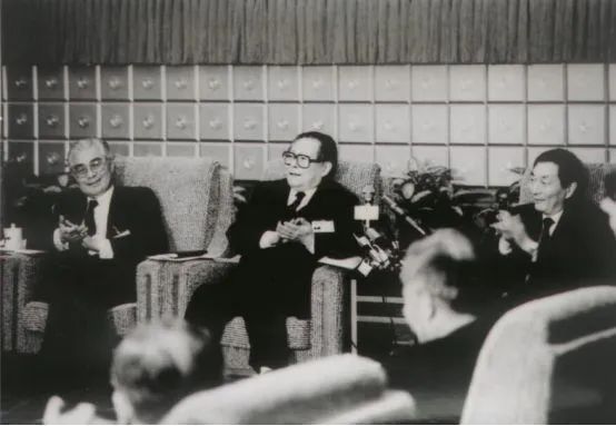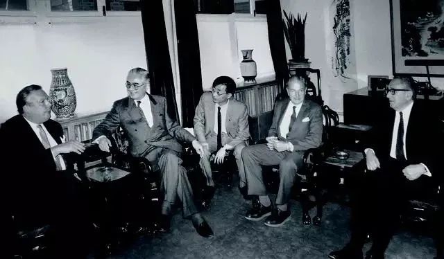 1988年5月,榮毅仁在家中會見美國大通銀行董事長布、大通銀行國際諮詢委員會主席戴維·洛克菲勒和美國前國務卿基辛格,共繪國際經濟藍圖。
