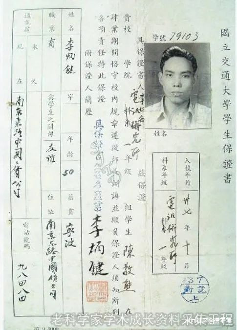 1948年,陳敬熊入學國立上海交通大學就讀的保證書。