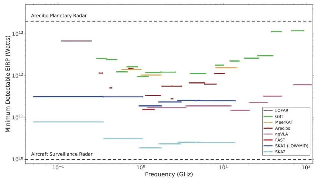當前各主要參與SETI研究的望遠鏡在相同觀測參數下的靈敏度對比(來自Margot等人所撰寫的“天文2020”建議書)