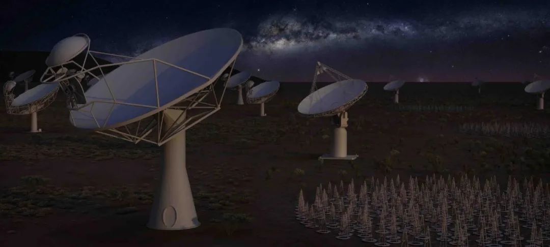 在夜間運行的第一階段SKA。圖為SKA反射面天線和低頻孔徑陣列,背景為MeerKAT和ASKAP反射面天線