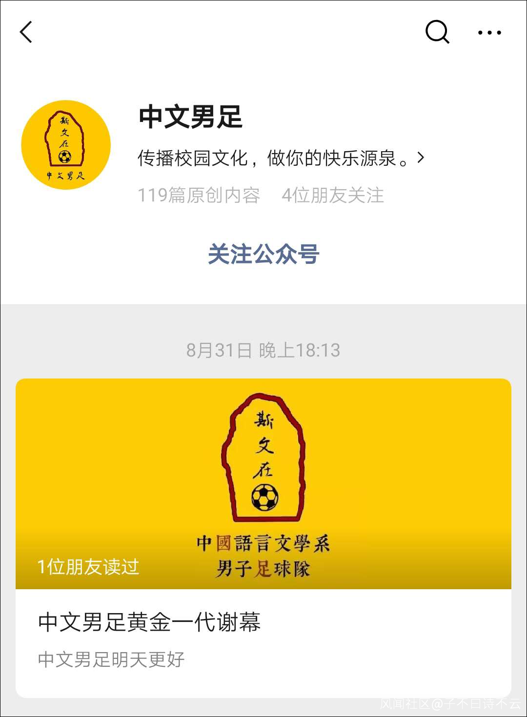 目前,該公眾號最新的一篇推文,是發佈於8月31日的《中文男足黃金一代謝幕》。