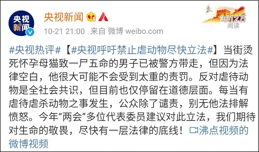 央視新聞發表評論,認為反對虐待動物已是全社會的共識,帶頭呼籲禁止虐待動物立法。