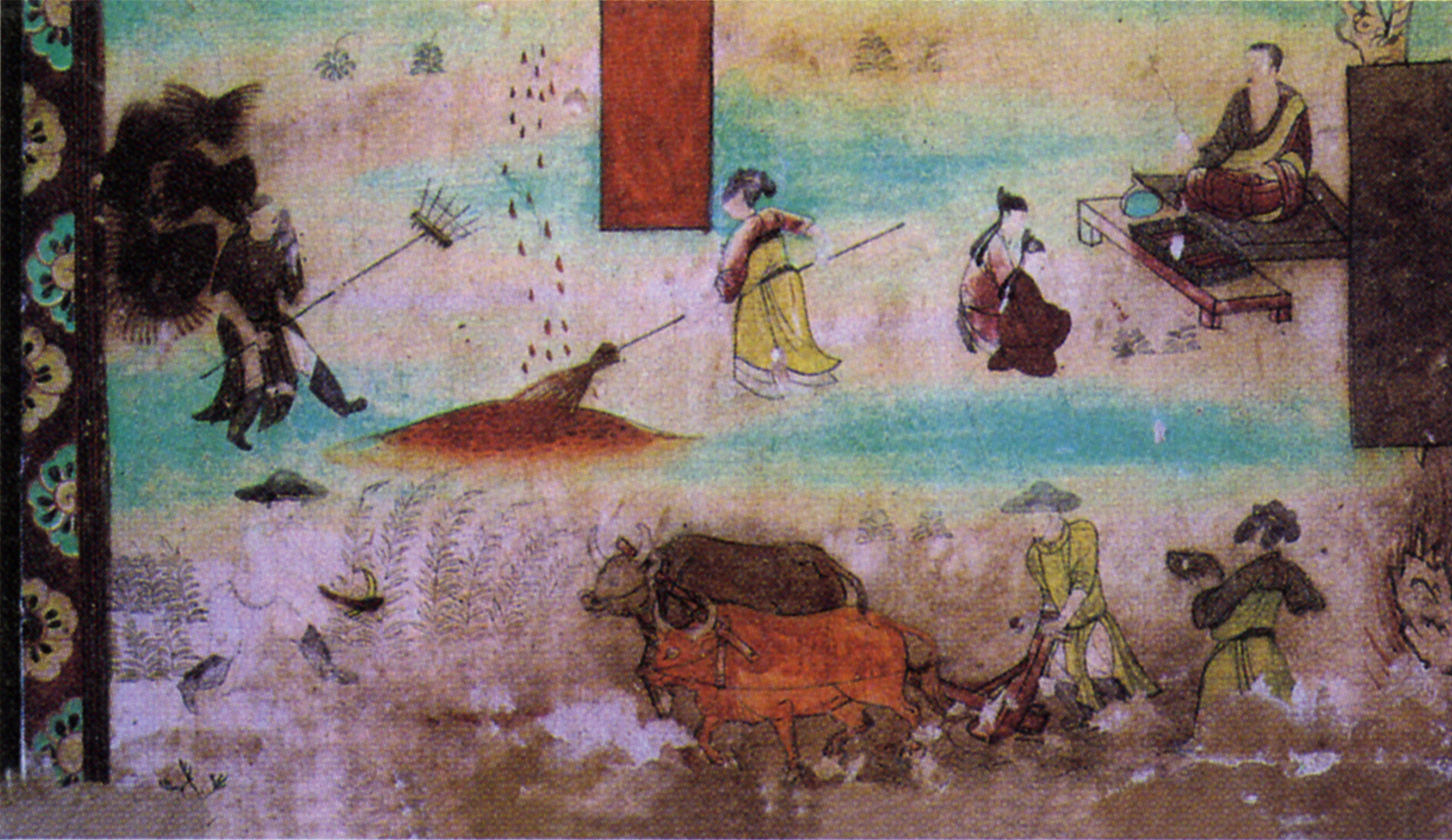 敦煌壁畫《彌勒經變局部·農耕》。視覺中國 資料圖