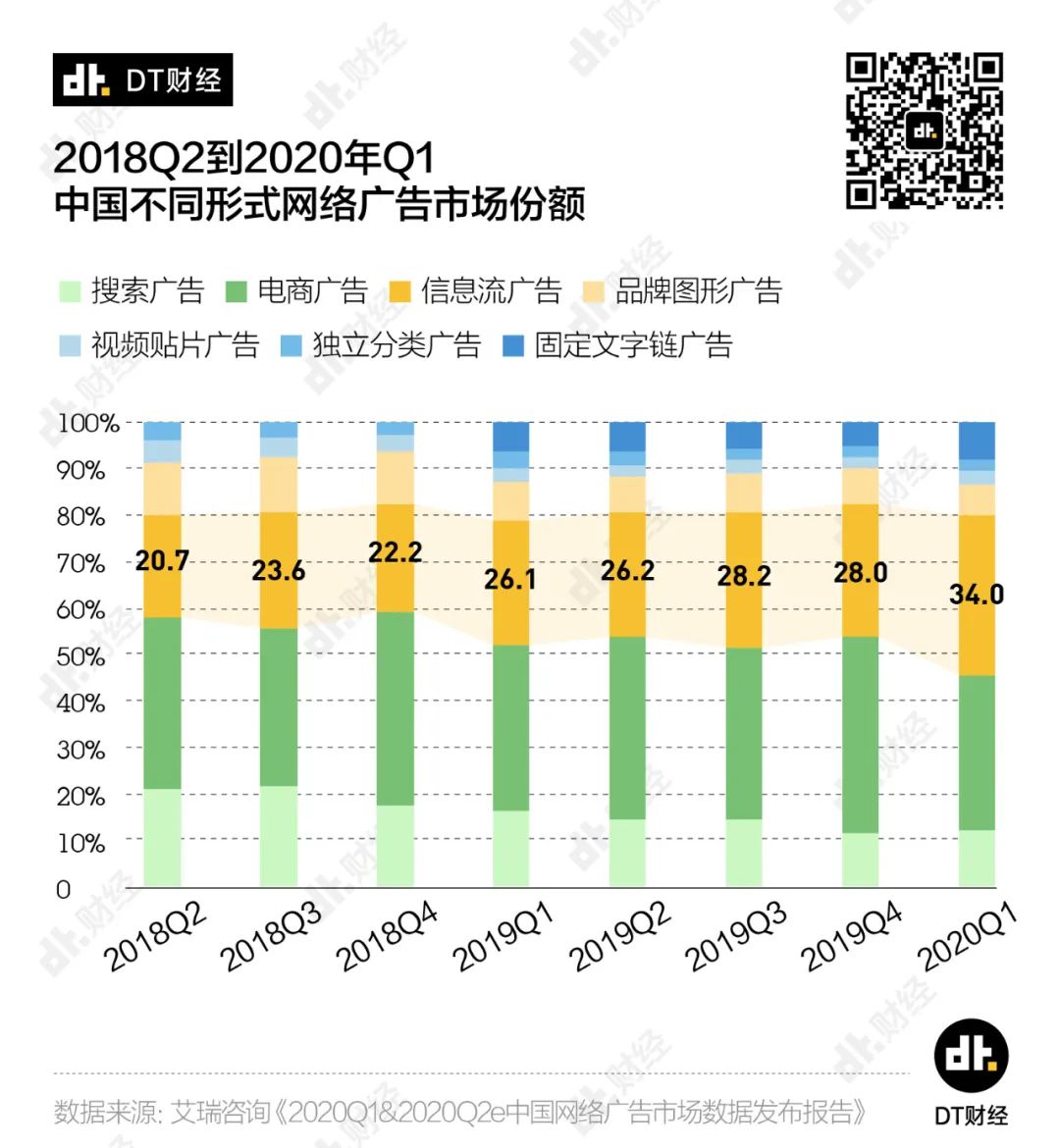 這就是內容和流量運作都更加精細的信息流廣告。數據證明,確實是有更多營銷預算投入到 了各大流量平台的信息流廣告業務裏。 從市場份額來看,信息流廣告從2019年第4季度的 28%,上升到了2020年第1季度的34%。