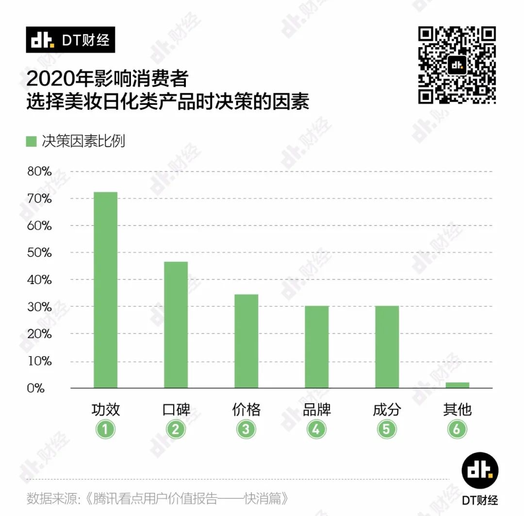 騰訊看點最近做的用户購物偏好調研數據就顯示,大家在選購美妝日化產品時,最關注的因 素依次是功效、口碑和價格,品牌僅排在第4位。 在選購食品飲料的時候,最看重的也是 口感而非品牌。