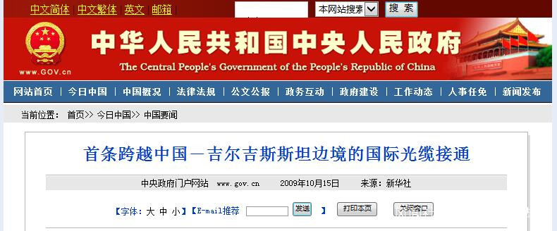 首條跨越中國―吉爾吉斯斯坦邊境的國際光纜,2009年10月15日在海拔3000多米的中國“西陲第一哨”斯姆哈納哨所樓前順利熔纖接通,這標誌着中吉兩國電信合作邁入高效、快捷的新階段。