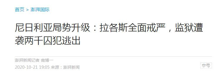 俄羅斯衞星通訊社10月21日援引尼日利亞《抨擊報》(Punch)消息稱,該國軍人向抗議者開槍,造成6人死亡,多人受傷。