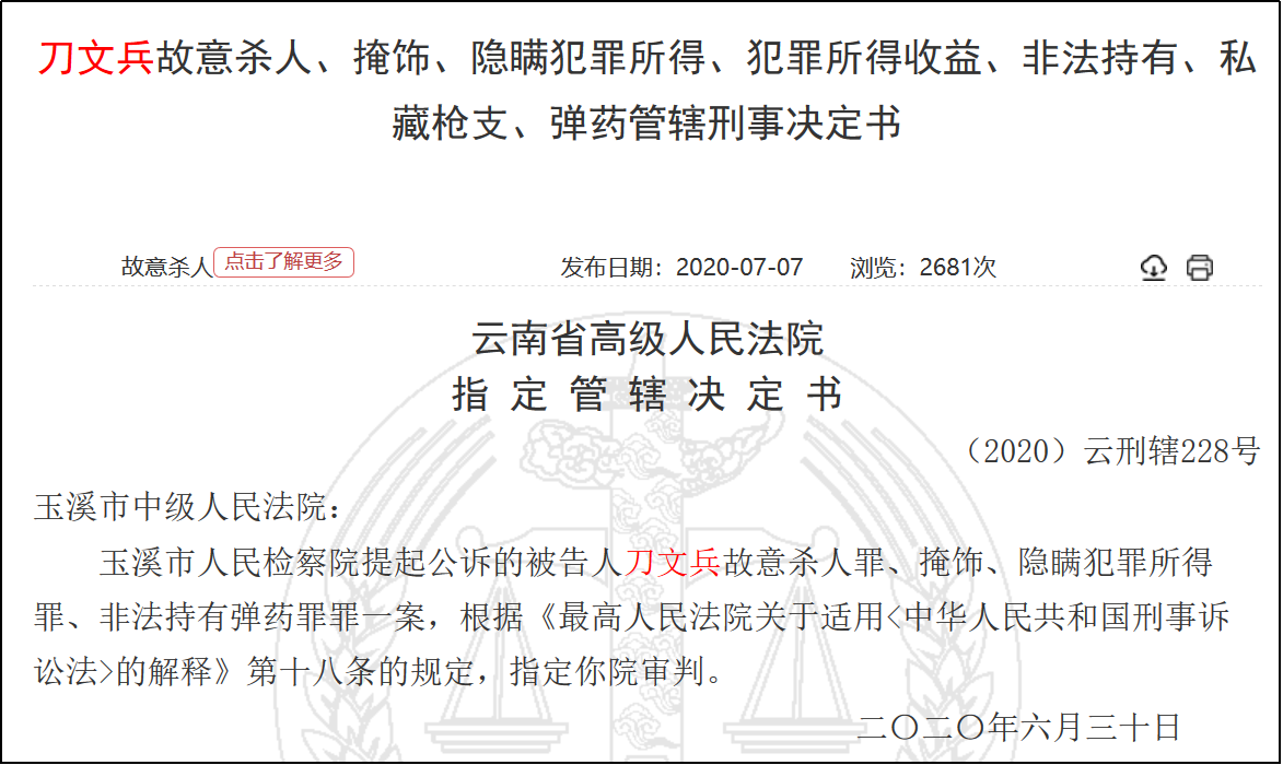 10月21日上午,一份《刀文兵故意殺人、掩飾、隱瞞犯罪所得、犯罪所得收益、非法持有、私藏槍支、彈藥管轄刑事決定書》引發網友討論。