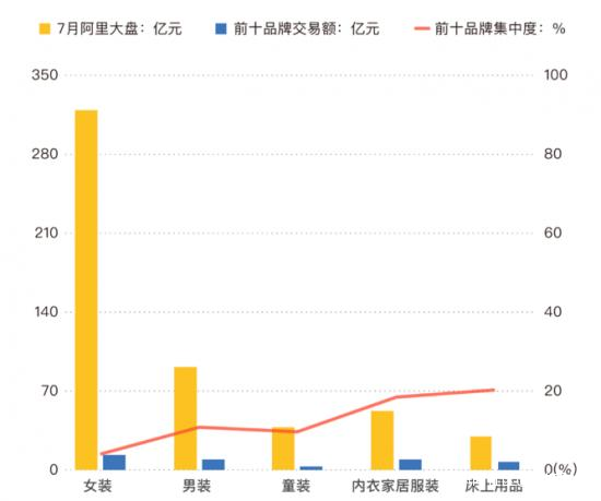 “進擊波財經”曾經整理過2020年淘寶大盤的數據。如下圖所示,女裝品類,前十品牌的交易額佔總交易的4%,而內衣和家居服的這個數字是18%。