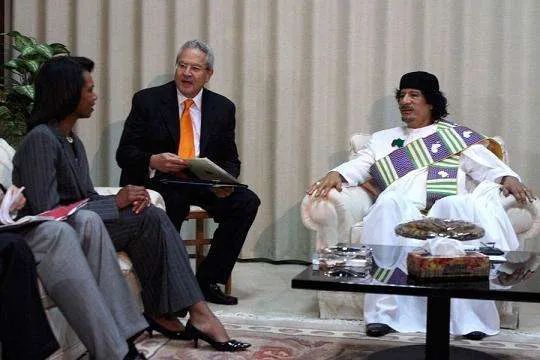 由於受不了西方國家長期的經濟制裁,2003年起,卡扎菲採取了一些軟化外交措施。美國國務卿賴斯到訪利比亞,他一臉賤嗖嗖地喊,“我親愛的非洲黑姑娘”。
