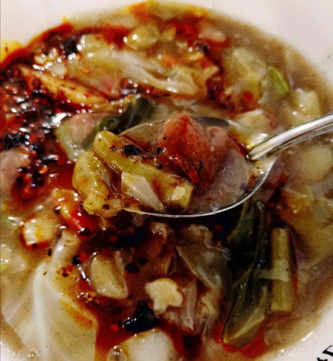 圓潤的牛肉丸,各種各樣的蔬菜,濃香的牛羊骨湯。這三者的結合,造就了西安本地人的一份地道早餐。牛肉丸筋道彈牙,蓮花白入口即化,紅豔豔的辣椒油令人舌尖發麻。