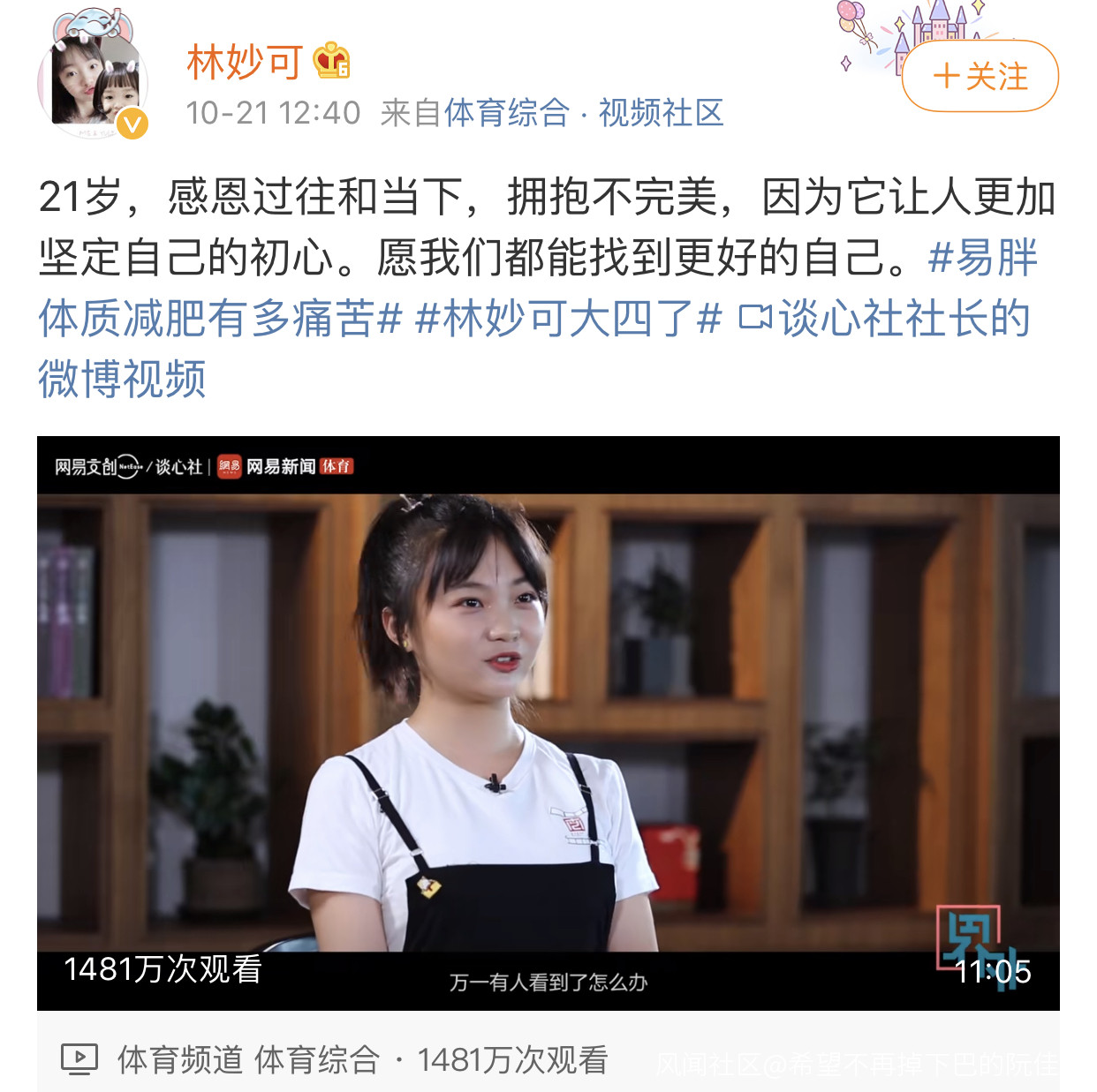 視頻中,林妙可提起在北京奧運會開幕式上的表演以及“假唱”事件,同時也感謝了張藝謀導演之前對此事做出的回應,“21歲,感恩過往和當下,擁抱不完美,因為它讓人更加堅定自己的初心。願我們都能找到更好的自己。”