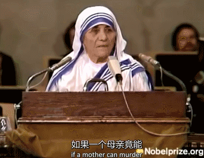 在特蕾莎獲得諾貝爾和平獎的時候,她致辭説,墮胎就是母親對孩子的謀殺。
