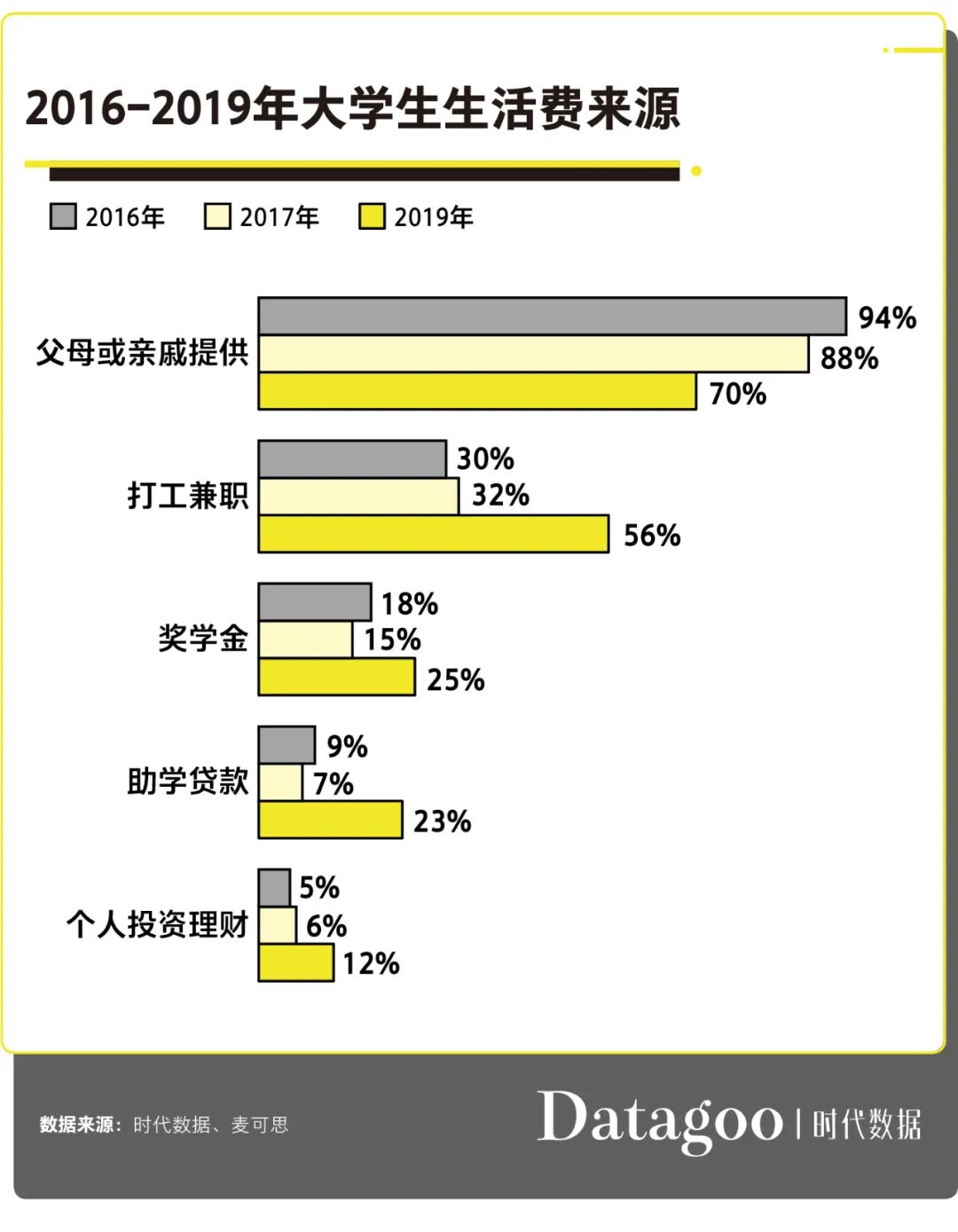 據麥可思調研發現,從 2016 年到 2019 年,不跟父母親戚要錢的大學生從 6% 上漲到 30% ,努力打工兼職的人數佔比也從 30% 躍升至 56% 。