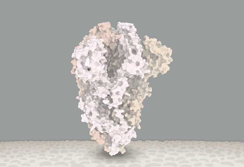 新冠刺突蛋白的構象變化,紅圈內為D614G突變引起變化的位置。據信,這個突變能讓刺突蛋白更易進入與RBD結合的構象。圖源:Structural data from K. Shen & J. Luban