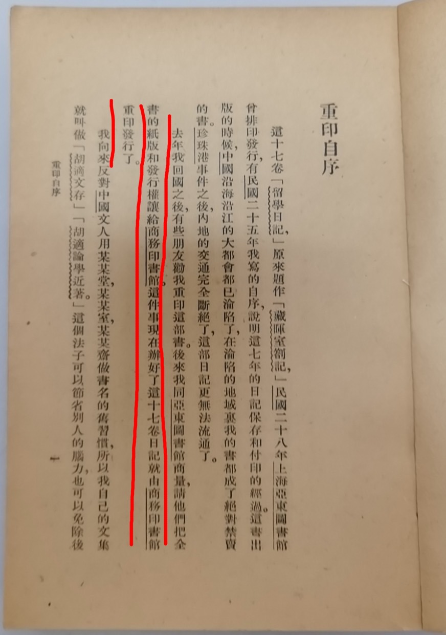 而在商務版胡適所撰的重印自序中,胡適寫道:去年我回國之後,有些朋友勸我重印這部書。後來我同亞東圖書館商量,請他們把全書的紙版和發行權讓給商務印書館,這件事現在辦好了,這十七卷日記就由商務印書館重印發行了。