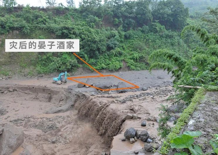 我們之所以拍下這個照片是因為覺得它是泥石流溝,就跟當地的同志説這條溝是泥石流溝,這個房子可能有些危險。但是他們存在僥倖心理,就讓40多個工人住在二樓,一樓是晏子酒家——這個餐廳菜還蠻好吃的。但很不幸的是,2012年6月28號,一場泥石流把晏子酒家衝到金沙江裏面去了,總共死了40個人。