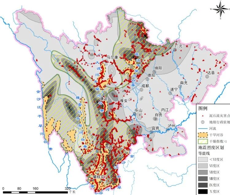 這些紅點點就是泥石流災害點,灰綠色的就是地震帶,黃色的是乾旱河谷,而像東北邊達州那些降水量比較大的地方,災害點反倒少。
