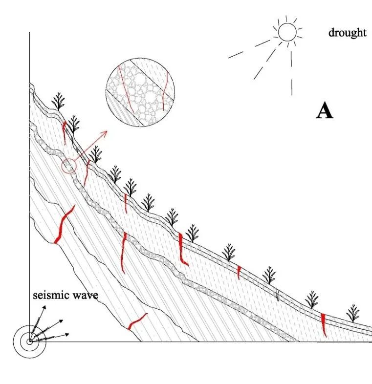 乾旱產生裂隙,地震在地下也產生裂隙,這就形成了新的通道,地表水就很容易藉此滲透到地下,容易產生滑坡和泥石流。