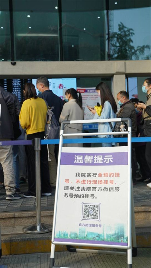 醫院門口、門診大廳和各樓層分診台也貼出“温馨提示”:“我院實行全預約掛號,不進行現場掛號,請關注我院官方微信服務號預約掛號”。