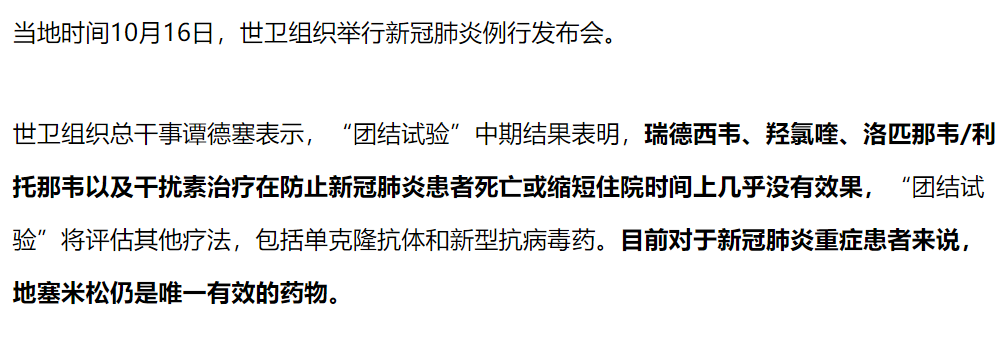 第一件:2020年10月16日,世衞組織總幹事譚德塞表示,“團結試驗”中期結果表明,瑞德西韋、羥氯喹、洛匹那韋/利托那韋以及干擾素治療在防止新冠肺炎患者死亡或縮短住院時間上幾乎沒有效果,“團結試驗”將評估其他療法,包括單克隆抗體和新型抗病毒藥。目前對於新冠肺炎重症患者來説,地塞米松仍是唯一有效的藥物。