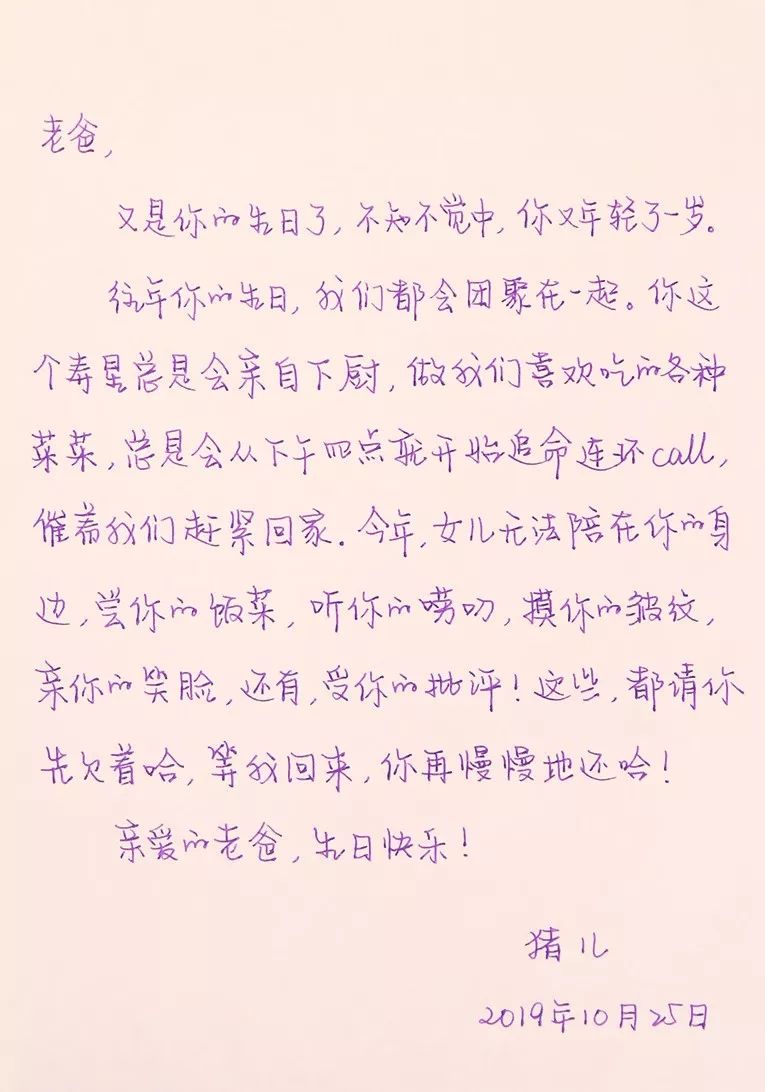 往年你的生日,我們都會團聚在一起。你這個壽星總是會親自下廚,做我們喜歡吃的各種菜菜,總是會從下午四點就開始追命連環CALL,催着我們趕緊回家。今年,女兒無法陪在你的身邊,嘗你的飯菜,聽你的嘮叨,摸你的皺紋,親你的笑臉,還有,受你的批評!這些,都請你先欠着哈,等我回來,你再慢慢地還哈!