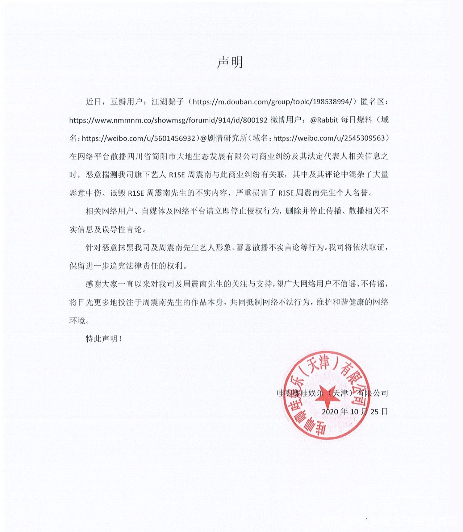 10月25日下午,周震南父親周勇百分百控股的公司“四川省簡陽市大地生態發展有限公司”及周震南的經紀公司哇唧唧哇先後發聲明回應。