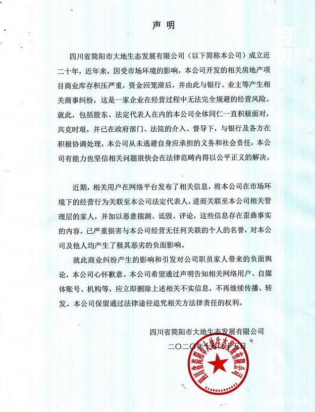 據悉,早在2017年,就有簡陽市民反映自己購買上述公司旗下樓盤“簡陽大地花園”的房子後遭遇各類商業糾紛,包括未能如期領取房產證、房屋維修基金使用情況不明等,簡陽市有關部門也多次在問政平台上進行答覆。