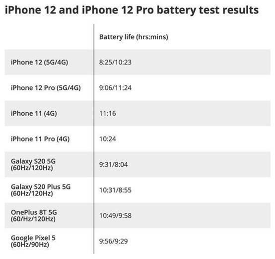 在AT&T的5G網絡上,數據顯示iPhone12在4G狀態下,續航壽命能夠達到10小時23分鐘,但是在5G狀態下卻只能達到8小時25分鐘,在T-Mobile的5G網絡上iPhone 12 Pro持續了9個小時零6分鐘,表現略好一些。