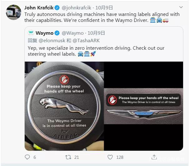 在這場爭論中,Waymo回應道自己早已實現了“零干預”自動駕駛,Waymo展示出一張照片説明他們在方向盤上張貼了“不要將手放在方向盤上”的提示。