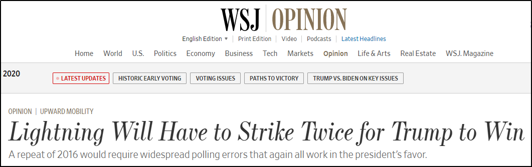 當地時間10月20日,《華爾街日報》發表了一篇題為《特朗普要連任,除非一個地方兩次被雷劈中》的評論。
