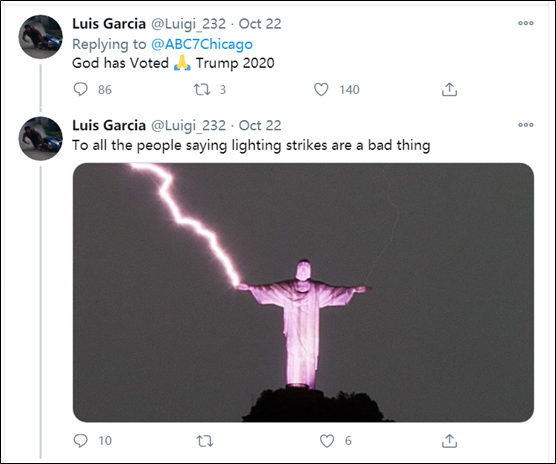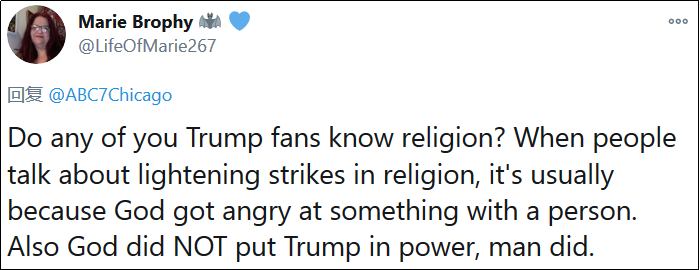 “你們特朗普粉絲懂宗教嗎?人們説宗教上的雷擊,那是上帝在對某人發火。”