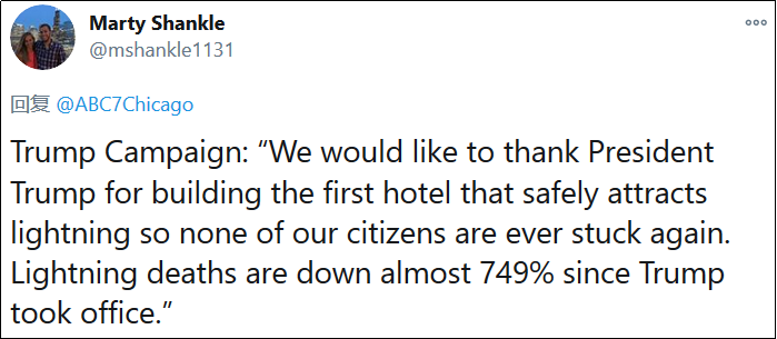 “特朗普就任4年來,被雷劈的人數少了749%。”