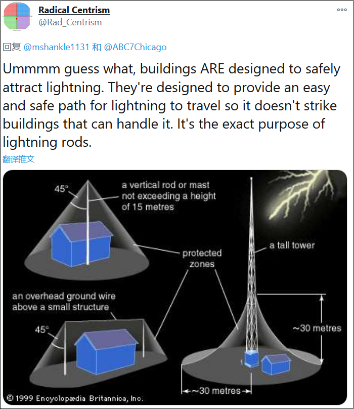 原因是,像這種高層建築物往往會被設計成安全吸引閃電並傳導至大地的結構,以防建築本體被破壞。