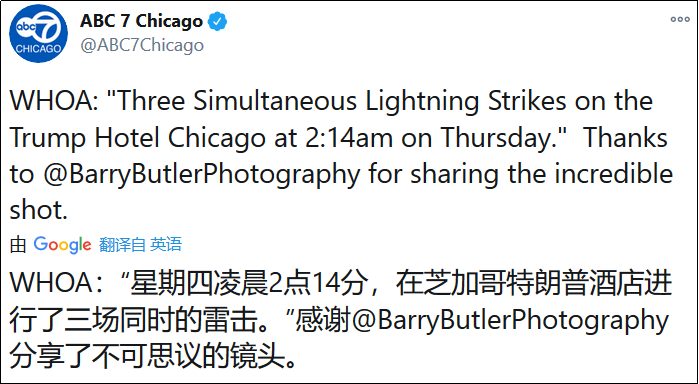 三道雷同時擊中了位於芝加哥的特朗普國際酒店(Trump International Hotel)。