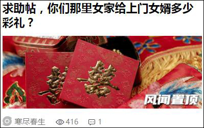 今天還有兩位觀友發來求助帖,一位是詢問各位觀友當地給上門女婿多少彩禮。