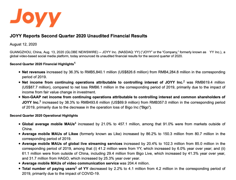 在YY公佈的2020年第二季度未經審計財務報告中,歡聚集團全球平均移動端月活躍用户同比增長21.0%至4.57億,其中91.0%來自海外市場。全球直播服務的移動端月活躍用户同比增長20.4%至1.023億,其中YY直播用户4120萬,中國以外為6110萬,包括來自於Bigo的2940萬以及來自Hago的3170萬。